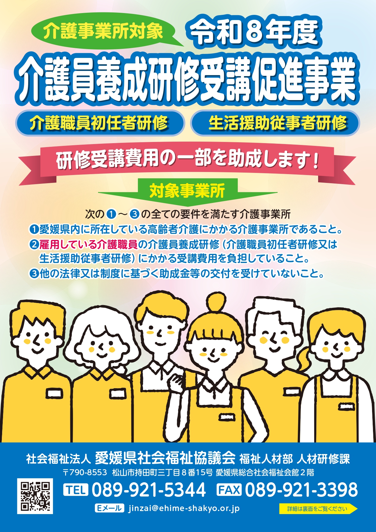 愛媛県からの委託を受け、介護事業所が雇用する介護職員に介護員養成研修を受講させた際の受講料を助成することにより、介護職員の確保・定着を図ることを目的として、標記事業を実施することとなりました。