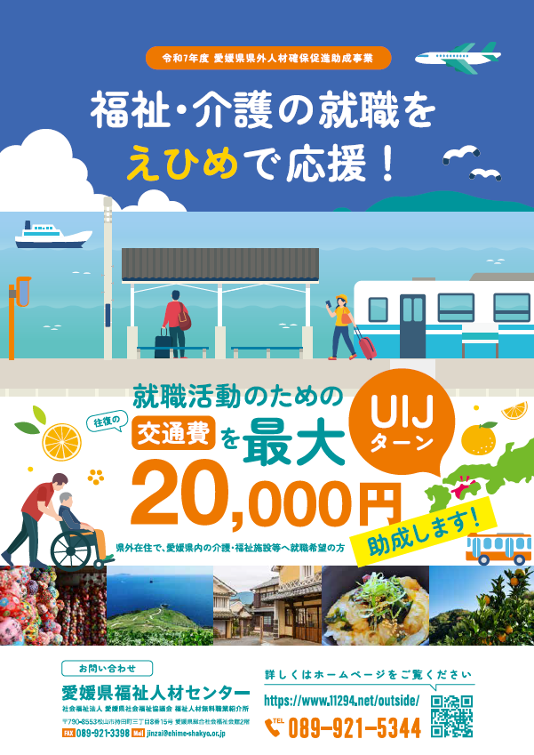 愛媛県内の介護・福祉施設等への就職を検討している県外在住の方が、愛媛県内の介護・福祉施設等へ就職する際に行う就職活動に要した交通費を助成することにより、愛媛県内の介護人材の確保・定着を図ることを目的として、実施いたします。