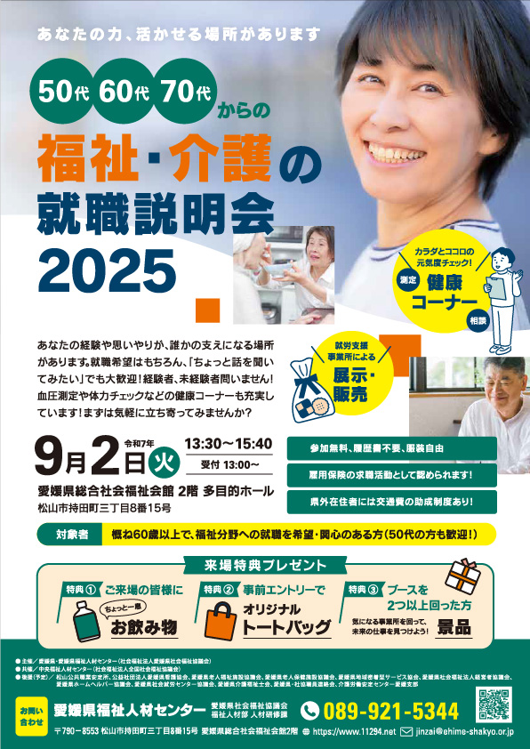 求職者が、求人事業所の職員と直接面談することができる職場説明会を開催します。①「未経験、介護助手相談コーナー」(14:00~14:30)介護助手及び介護の入門的研修事前説明を行います。(愛媛県福祉人材センターブース)②「健康コーナー」(13:40~15:40)愛媛県看護協会による血圧・酸素飽和度測定、介護福祉士会による介護相談、愛媛県理学療法士会による体力測定、愛媛県作業療法士会による脳トレゲーム、自助具製作体験・福祉用具の困りごと相談を実施します。③就労支援事業所の展示・販売会(13:30~15:40)社会福祉法人松山共生会 ポッポ苑(手焼きせんべい等予定)、社会福祉法人福角会 松山福祉園(クッキー、パン等予定)